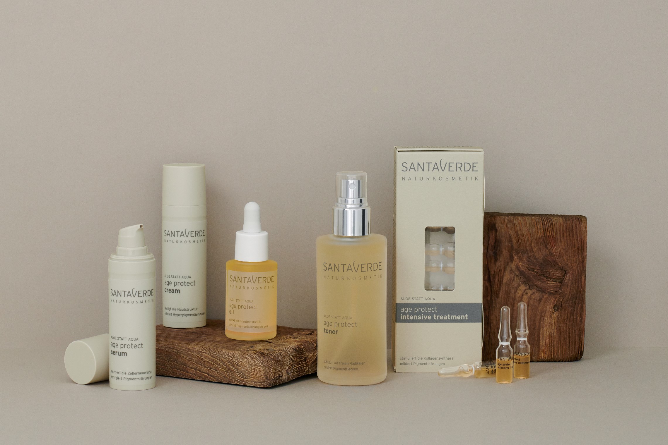 Die innovative Anti-Ageing Kosmetik age protect bündelt kraftvolle Wirkstoffe aus der Natur und versorgt anspruchsvolle Haut mit allem, was sie für ein strahlendes, sanft geglättetes und ebenmäßiges Hautbild braucht. Exklusiver Leitwirkstoff ist, neben purem Aloe Vera Saft, wertvoller Aloe Vera Blütennektar mit einer hohen antioxidativen Kapazität. Ein neuartiger Wirkstoffkomplex aus Pflanzenwurzeln vermindert Pigmentstörungen und stimuliert die Kollagensynthese. Feine Öle verleihen ein entspanntes, geschmeidiges Hautgefühl.